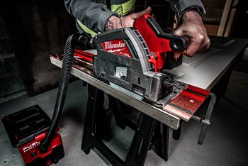 De nieuwe M18 FUEL invalcirkelzaag levert krachtige en duurzame prestaties voor zaagsnedes met dezelfde voedingssnelheid als een gelijkwaardige AC cirkelzaag. De diepte-instelling heeft twee schalen (op rail/zonder rail). Deze kunnen eenvoudig worden aangepast met een druk op de knop. Een extreem vlakke beschermkap maakt vlakzagen met de muur mogelijk op een afstand van slechts 12 mm. De aanslag maakt een terugsnede van 1 mm mogelijk om splinters in gelamineerde materialen te minimaliseren. Een snijlijnvenster aan de zijkant vergemakkelijkt het zagen waarbij de voorkant van het blad zichtbaar moet zijn. Een intrekbaar spouwmes zorgt ervoor dat het spouwmes in positie blijft, zelfs bij het maken van invalzaagsneden. In combinatie met een extern afzuigsysteem (DEK26 compatibel) is een zeer efficiënte stofafzuiging mogelijk. Perfect afgestemd op het gebruik van de accu invalcirkelzaag is de nieuwe Milwaukee GR 1400 aluminium geleiderail met een lengte van 1,4 meter. Meerdere rails kunnen nauwkeurig aan elkaar worden bevestigd om het werkoppervlak te vergroten.